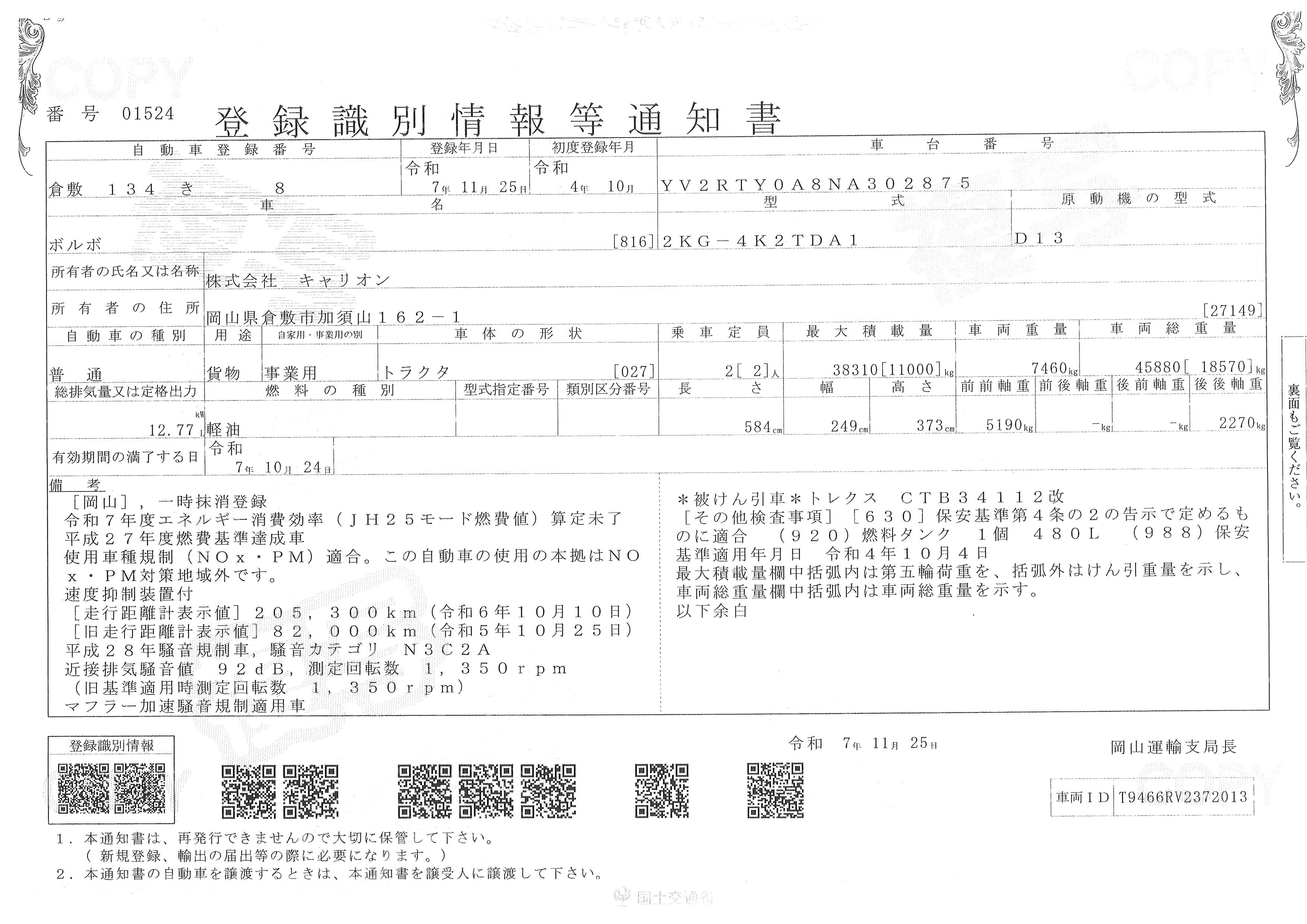 | 積載量 | 11,000kg | メーカー | VOLVO | ボディメーカー | |